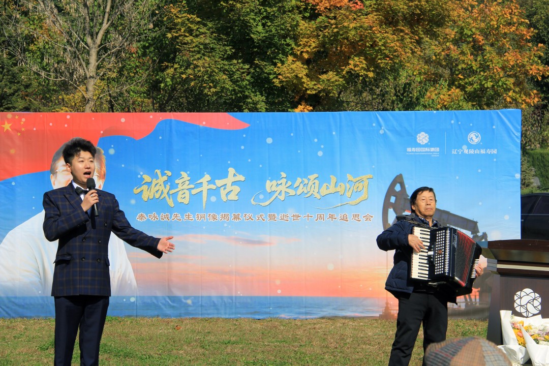 金秋送爽,松柏凝翠。10月18日上午,我国著名作曲家、音乐教育家秦咏诚先生铜像揭幕仪式暨逝世十周年追思会,在辽宁观陵山福寿园中华抗战五十年纪念园温情举行。此次活动以“诚音千古·咏颂山河”为主题,深切缅怀秦咏诚先生为中国音乐事业作出的卓越贡献,颂扬其不朽的艺术精神与家国情怀。上午十时,仪式在悠扬深情的《我和我的祖国》旋律中正式开始。这首由秦咏诚先生谱曲、传唱数十载、激荡无数中华儿女心灵的经典之作,在现场上空回荡,瞬间将所有人的思绪拉回到那个激情燃烧的岁月,也道出了对先生最深切的思念与最高的敬意。